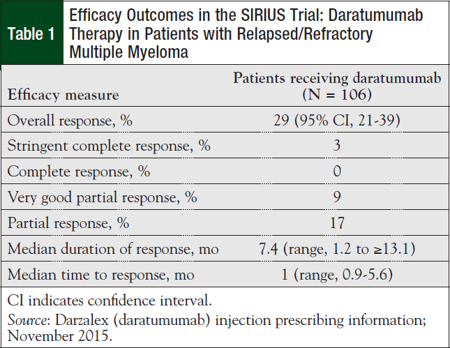 Overall, 2 open-label studies demonstrated complete or partial responses in patients with relapsed and/or refractory multiple myeloma; these studies were the basis for the FDA’s approval of daratumumab.12-15