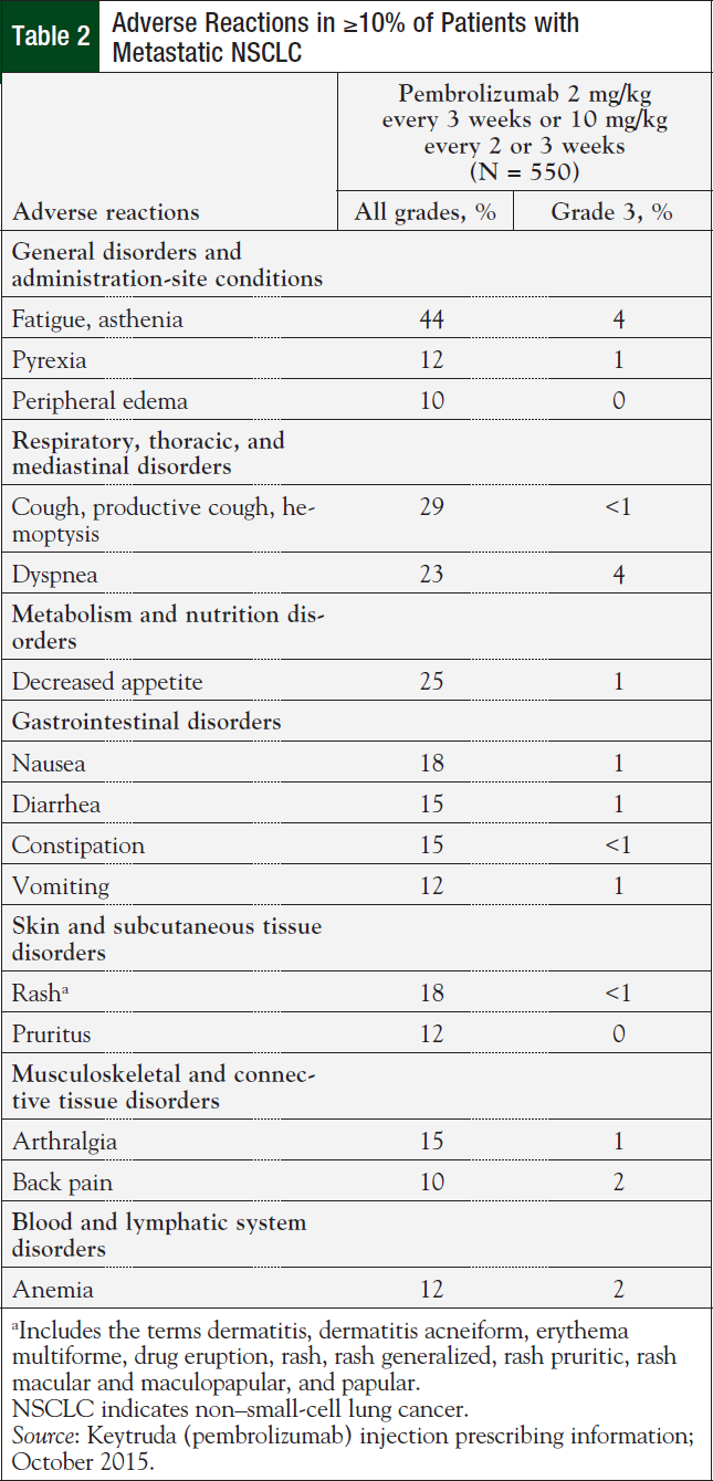 Among the 550 patients with previously treated metastatic NSCLC in KEYNOTE-001 who received pembrolizumab, the median duration of therapy was 2.8 months (range, 1 day to 25.6 months).10 Adverse reactions reported in at least 20% of patients included fatigue, decreased appetite, dyspnea, and cough (Table 2).10