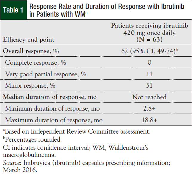 At the time of the initial analysis (at median duration of therapy of 11.7 months), the overall response rate was 62% (Table 1).10 The duration of response ranged from ≥2.8 months to ≥18.8 months. The median duration of response was not reached at the time of the FDA’s approval of ibrutinib for WM.10