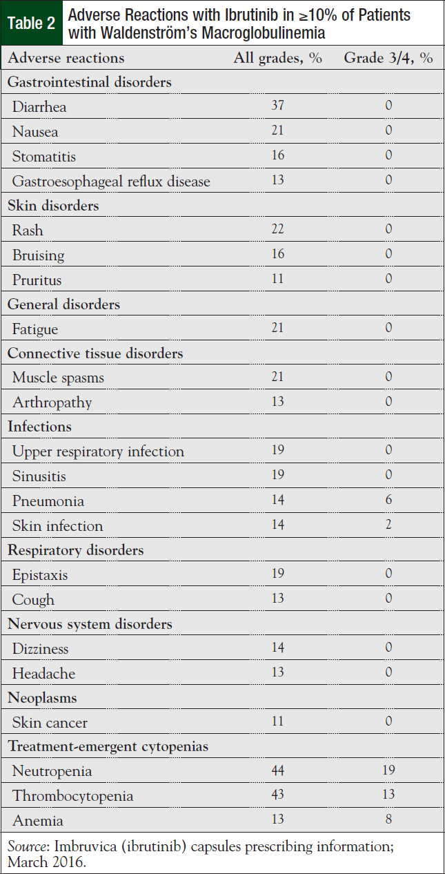 At the time of the initial data analysis of the clinical trial, adverse reactions in ≥20% of patients taking ibrutinib included neutropenia, thrombocytopenia, diarrhea, rash, nausea, muscle spasms, and fatigue (Table 2).10 Grade 3 or 4 events included neutropenia (19%), thrombocytopenia (13%), anemia (8%), pneumonia (6%), and skin infections (2%; Table 2).