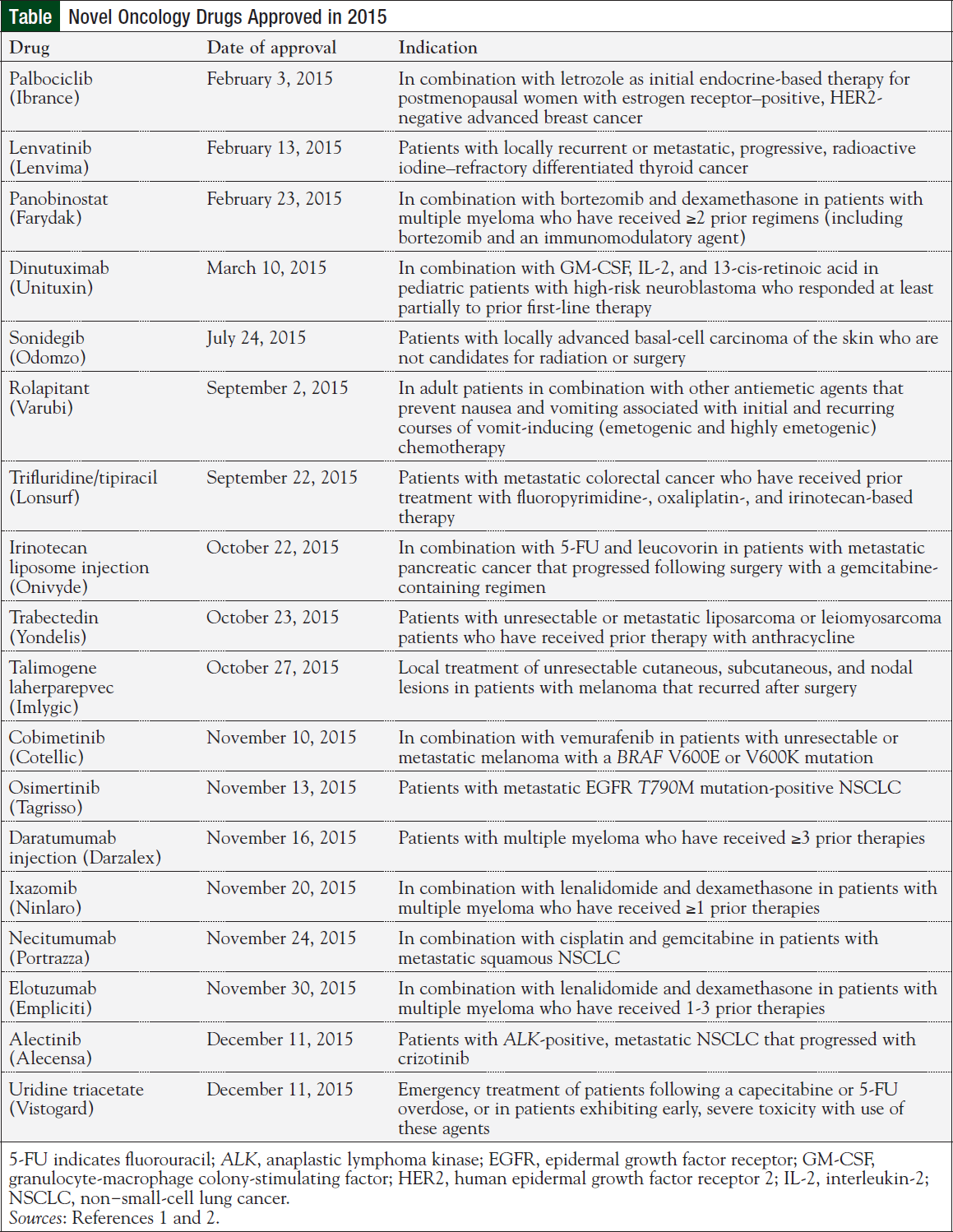 - US Food and Drug Administration. Hematology/oncology (cancer) approvals & safety notifications. www.fda.gov/Drugs/InformationOnDrugs/ApprovedDrugs/ucm279174.htm. Updated March 30, 2016. Accessed March 31, 2016.