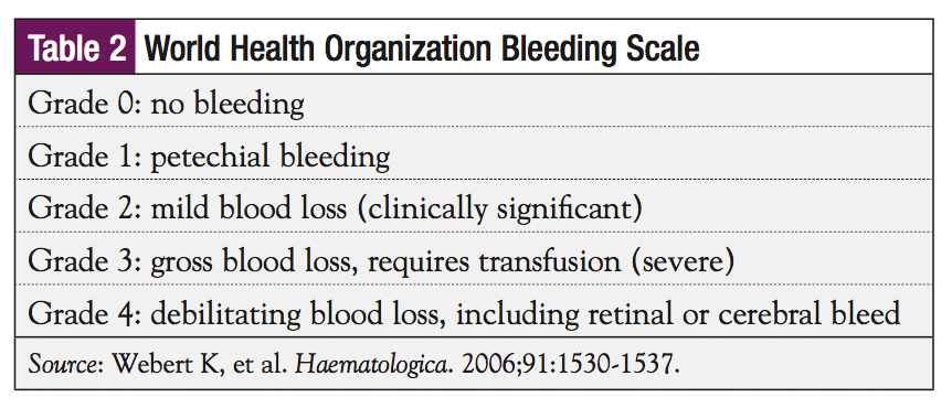 Thrombocytopenia is defined as a decrease in the number of circulating platelets to <100,000/μL.17 It is important to identify patients at risk for this condition using the standardized grading scale for bleeding developed by the World Health Organization (WHO; Table 2).18