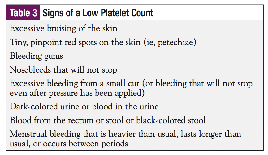 Patients should be advised on the signs of a low platelet count (Table 3) and when to report these symptoms to their healthcare providers.16