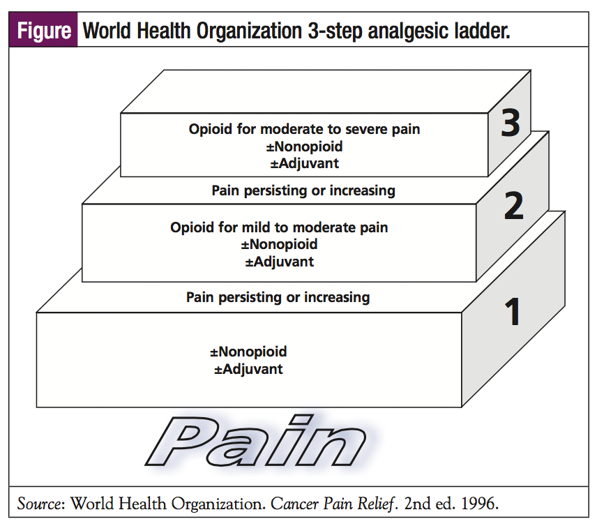 Pharmacologic pain management needs to be individualized based on the 3-step analgesic ladder. This ladder was originated by WHO to describe its guidelines for the use of drugs in the management of patients with pain (Figure).28 It was originally applied to the management of cancer-related pain, but it is now widely used for the management of all types of pain. The general principle is to start with ≥1 drugs on the “first rung,” then “climb the ladder” if pain is still present. Medications range from over-the-counter drugs with minimal side effects at the lowest rung to powerful opioids at the highest rung. Prescribers should start with the least invasive route, which is oral agents, and alter routes and dosages as needed. Sometimes just changing the opioid (opioid rotation) may benefit the patient. Long-acting opioids should be used when the patient experiences constant pain. Breakthrough pain needs to be managed when intermittent episodes of pain occur along with the patient’s constant pain. If the patient is experiencing incident pain, which may occur with a specific event, premedicating before the event will be helpful in decreasing the pain. Any patient who is taking an opioid for pain also needs to be on a bowel regimen to avoid constipation. Other side effects of opioids, such as nausea, also must be managed.28