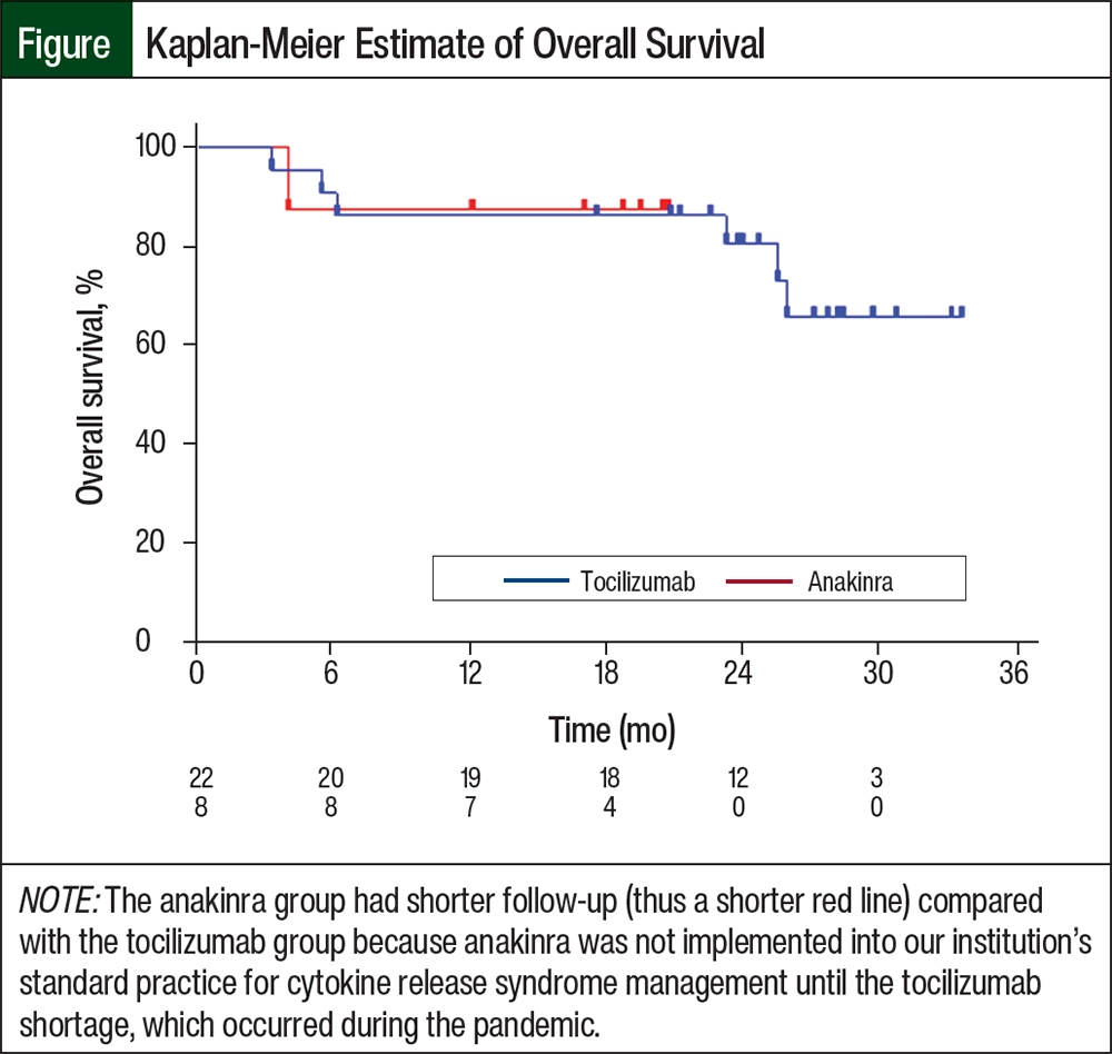 The 30-day and 100-day overall survival rates were similar between the groups (Table 2, Figure). There were no deaths before day 30 in either group. By day 100, 1 of 22 (4.5%) patients in the tocilizumab group died as a result of severe deconditioning that was secondary to ICANS at a maximum of grade 3 that ultimately resolved to grade 0, but with waxing and waning delirium that ultimately culminated in a decision to proceed to hospice. None of the patients in the anakinra group died before day 100 (P=.54).