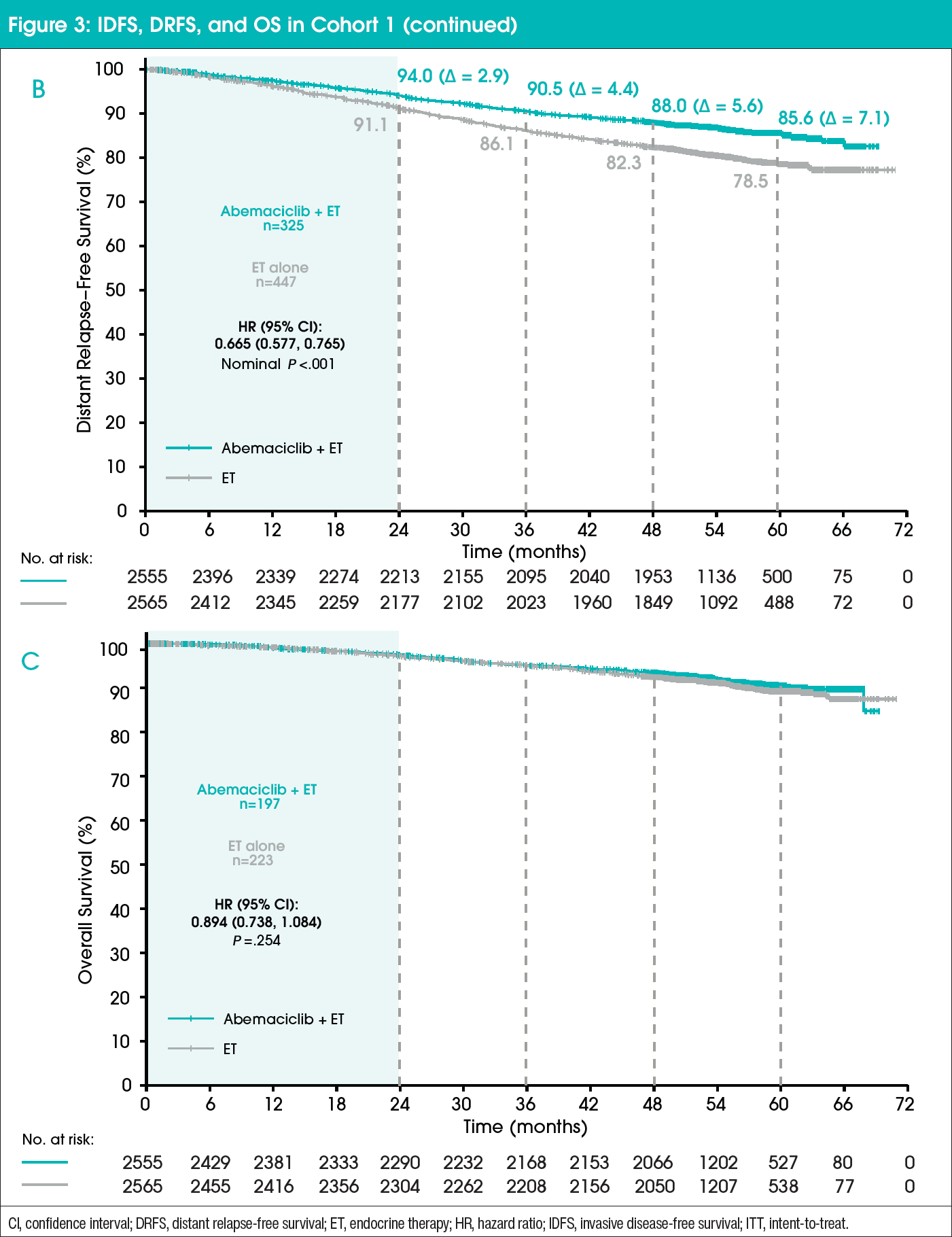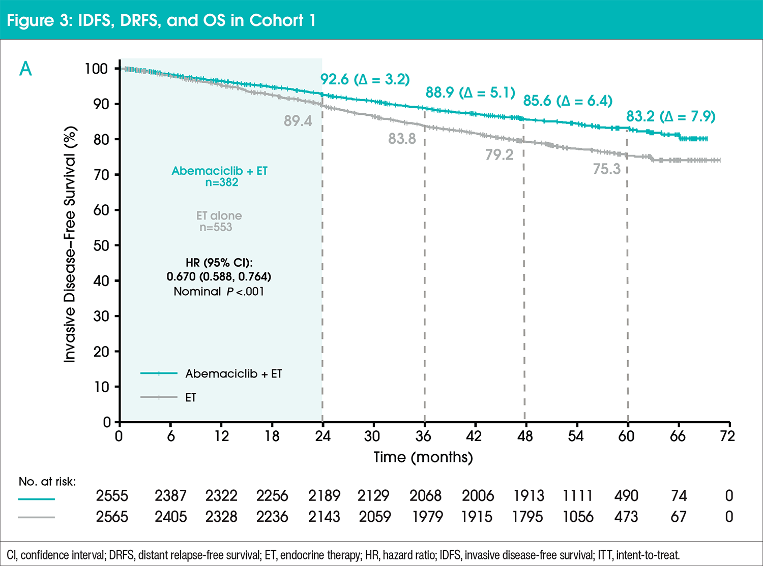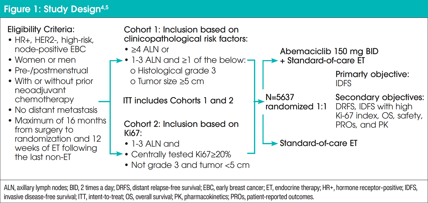 All patients underwent 1:1 randomization of abemaciclib 150 mg orally twice daily plus current standard-of-care adjuvant ET or current standard-of-care adjuvant ET alone for 2 years (treatment duration).4 The primary endpoint of the study was invasive disease-free survival (IDFS), defined as time from randomization to the first occurrence of local or regional recurrence, contralateral recurrence, second primary non-breast invasive cancer, distant recurrence, or death attributable to any cause. Secondary endpoints included distant relapse-free survival (DRFS), overall survival (OS), safety, and patient-reported outcomes.4 A prespecified OS interim analysis is planned to occur 2 years after the primary outcome analysis for IDFS.5