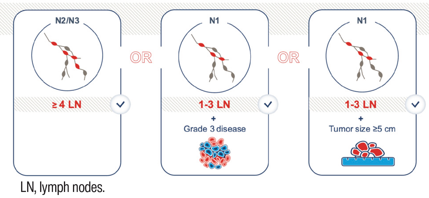 - Tolaney SM, Sammons S, Cortes J, et al. Real-world risk of recurrence by nodal status in patients with HR+, HER2-, node-positive, high-risk early breast cancer. Presented at: San Antonio Breast Cancer Symposium 47th Annual Meeting; San Antonio, TX; December 10-14, 2024.