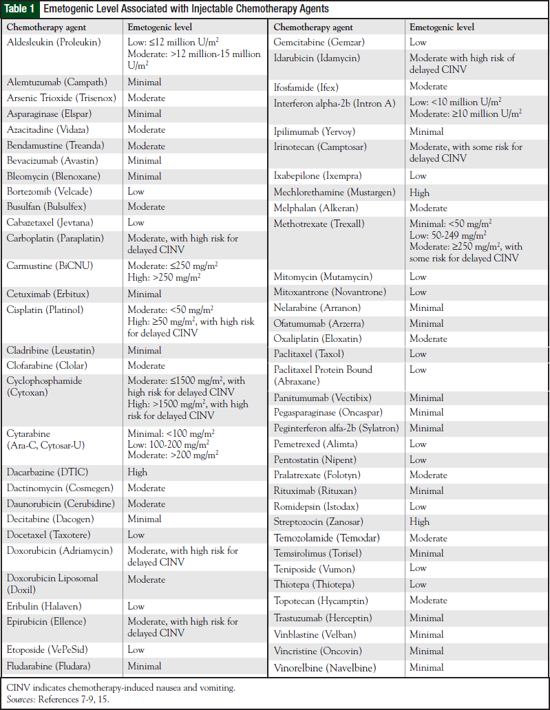 Patients receiving oral chemotherapy associated with a high or moderate emetic potential should be given an antiemetic medication before each dose of the oral chemotherapy.7,9,15 Those receiving oral chemotherapy with a low to minimal emetic potential, as-needed antiemetics should be sufficient. Recommendations from the more frequently updated NCCN guidelines are shown in Table 4.