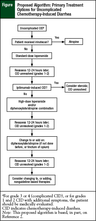 Severe diarrhea resulting in dehydration, neutro-penia, fever, malnutrition, renal insufficiency, infectious complications, or severe electrolyte imbalances can lead to hospitalization.2 The presence of CID can influence providers to change chemotherapy agents, reduce treatment doses, delay therapy, or even to discontinue therapy, leading to potentially worsened clinical outcomes.2 A study by Arbuckle and colleagues demonstrated that grades 1 and 2 diarrhea may lead to an alteration in chemotherapy for 11% of patients, whereas approximately 45% of patients experiencing any-grade CID required dose reduction in chemotherapy.3,4 Although it is well known that CID can result in significant morbidity and mortality, no comprehensive treatment guidelines exist for historically used and newly evaluated medications for the treatment of CID.