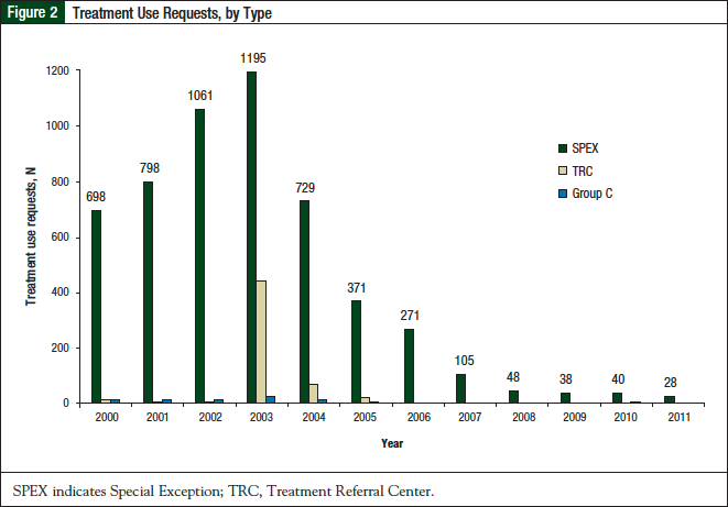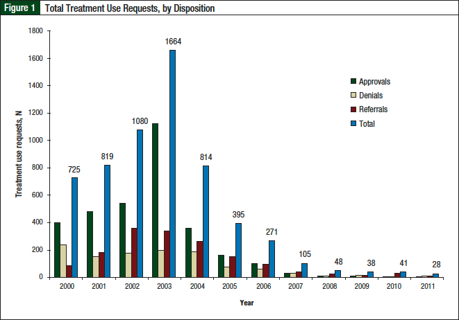 Results: More than 60% of requests were either referred or approved between 2000 and 2011. The peak number of requests was 1664 between 2000 and 2011 and occurred in 2003. The peak was mostly a result of Special Exception requests; however, more than 400 TRC requests and 20 Group C requests were approved that year. The total number of requests dropped precipitously after 2003, and since 2008 have totaled fewer than 50 annually. All Group C and TRC protocols were completed by March 2006. The lowest number of treatment use requests occurred in 2011.