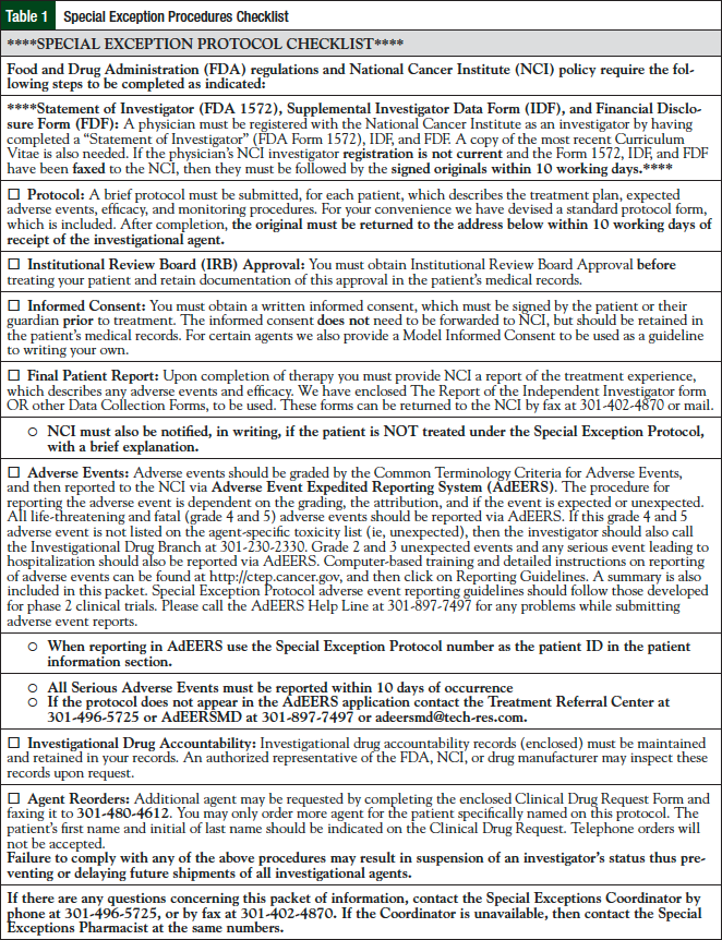The most common treatment protocol, the Special Exception protocol, is approved on a case-by-case basis and is written for individual patients.3,4 Special Exception agents: