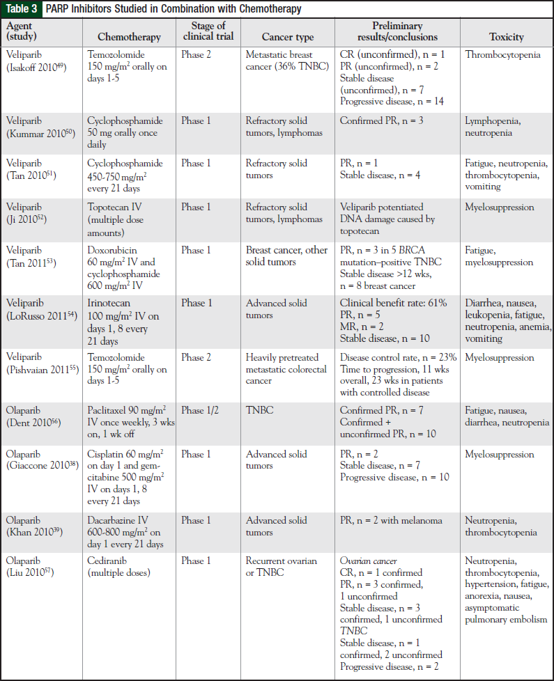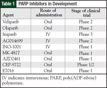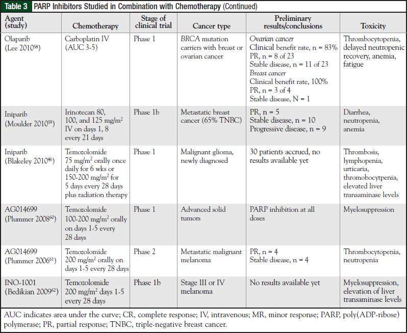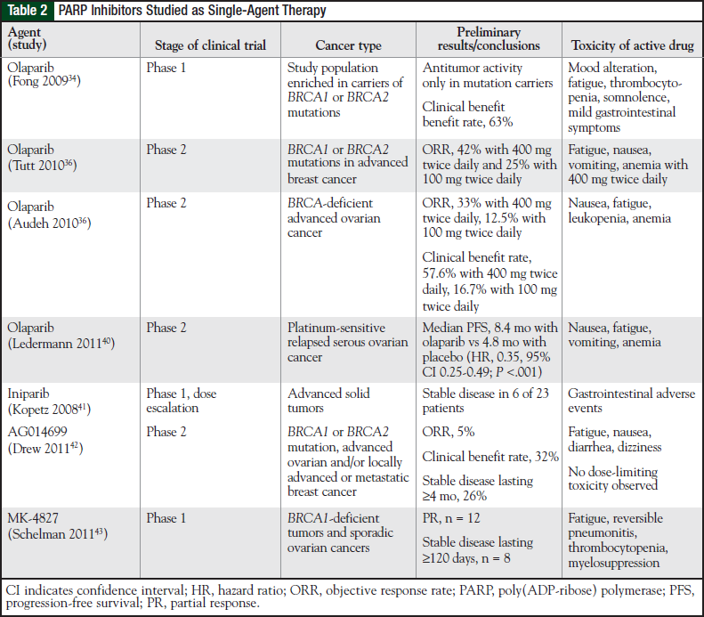 Phase 1 studies combining olaparib and chemotherapy in the treatment of other solid tumors are ongoing. In one study, the combination of gemcitabine, cisplatin, and olaparib was associated with significant myelosuppression.38 Similarly, in a study of olaparib therapy in combination with dacarbazine, the dose-limiting toxicities were neutropenia and thrombocytopenia. No responses were observed in chemotherapy-naïve patients with melanoma who received the optimally tolerated dose.39 Table 2 lists PARP inhibitors investigated as a single-agent therapy.34,36,37,40-43