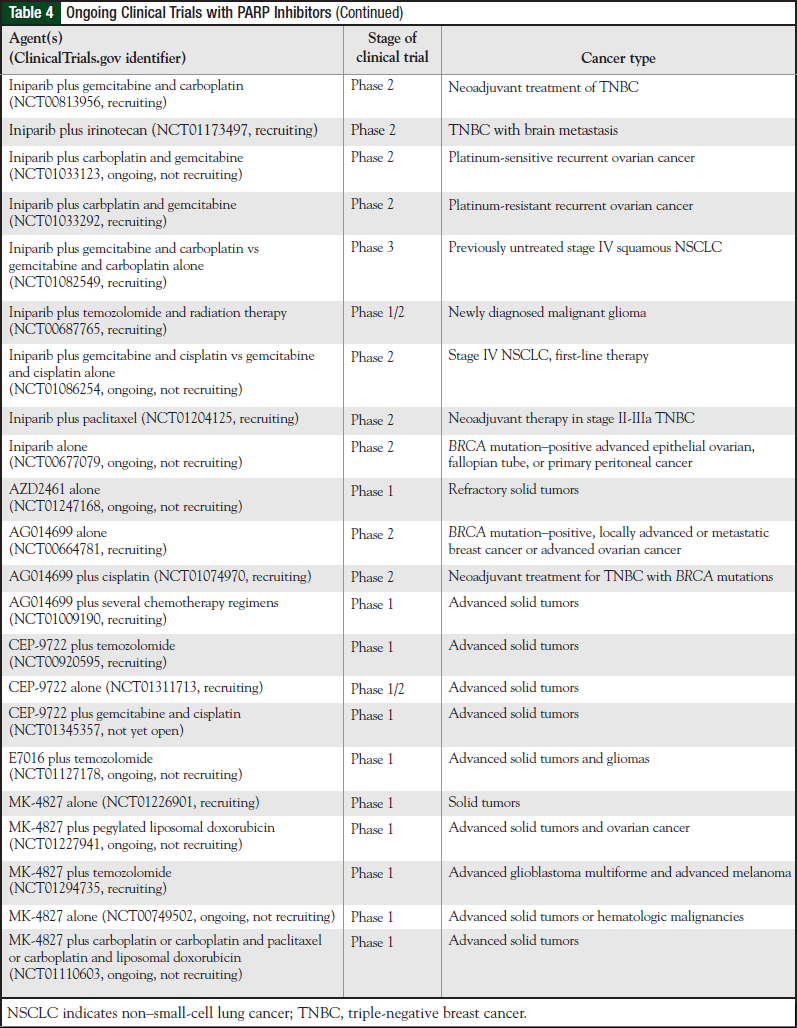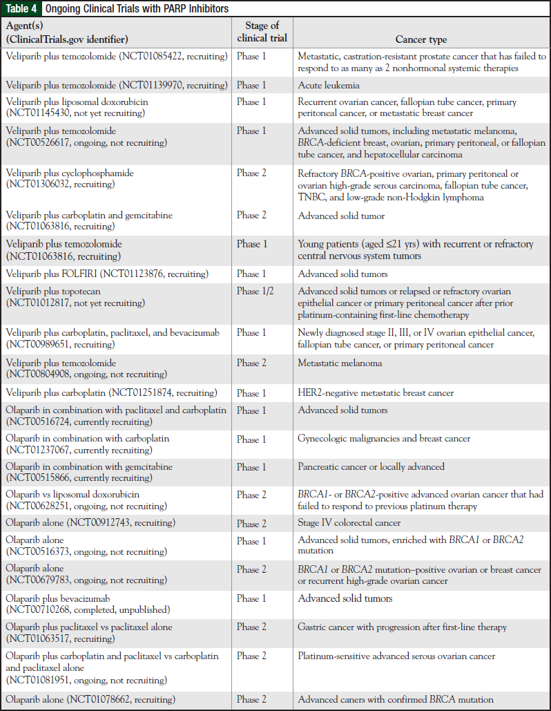 Table 4 presents ongoing clinical trials with PARP inhibitors. MK-4827, an inhibitor of PARP-1 and PARP-2, is in phase 1 clinical trials. MK-4827 has shown activity in BRCA mutation cell lines.72 The trials include patients with advanced ovarian cancer, melanoma, glioblastoma multiforme, and other solid tumors. In a recent study, single-agent therapy with MK-4827 showed activity in patients with BRCA mutation tumors and sporadic ovarian cancers.43