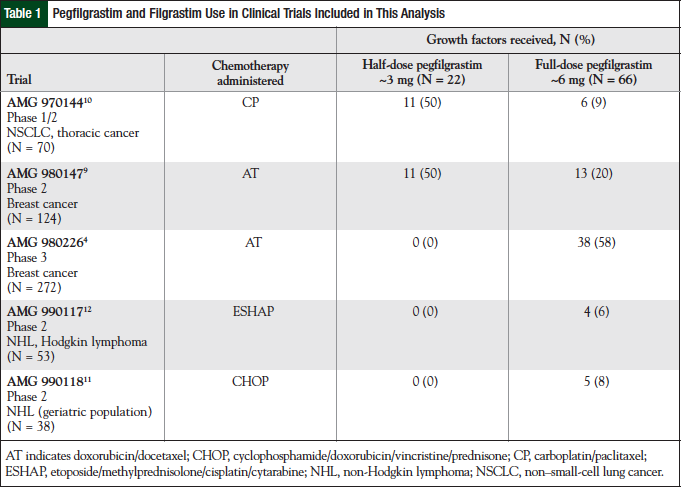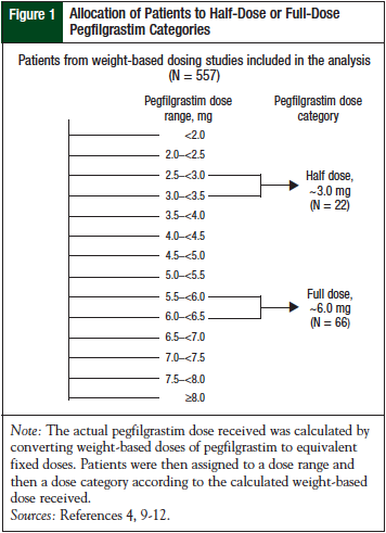 Methods: This retrospective analysis included first-cycle data from 5 published clinical studies of pegfilgrastim administered at various weight-based doses. A total of 557 patients were evaluated, 22 of whom received a dose equivalent to a fixed dose of approximately 3 mg (“half dose”) and 66 of whom received a dose equivalent to a fixed dose of approximately 6 mg (“full dose”). The primary end point was the incidence of FN; the secondary end point was the incidence of bone pain adverse events (any grade and grade 3/4).