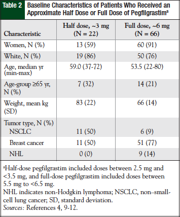 A total of 557 patients were categorized into dose groups according to the pegfilgrastim dose they received. Patients were then further categorized into the approximate half- or full-dose groups as follows: half-dose patients (N = 22) received doses between 2.5 mg and <3.5 mg (~3-mg dose), and full-dose patients (N = 66) received doses between 5.5 mg and <6.5 mg (~6-mg dose).