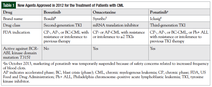 For most patients with CML, the initial treatment options can be one of the tyrosine kinase inhibitors (TKIs), including imatinib, nilotinib, or dasatinib; hematopoietic stem-cell transplantation; or enrollment in a clinical trial.1 Patients receiving a TKI who have partial to no cytogenetic response or cytogenetic relapse are candidates for therapy with an alternative TKI, other than imatinib.1 Resistance to first-line TKI treatment and a scarcity of therapeutic alternatives have led to the research and approval of 3 additional agents in 2012 for the treatment of CML, including bosutinib, omacetaxine mepesuccinate, and ponatinib (Table 1).4-6 However, in October 2013, the US Food and Drug Administration (FDA) temporarily suspended the marketing of ponatinib because of safety concerns related to increased frequency of blood clots.7