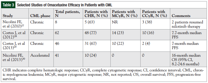 Major hematologic responses were also observed in patients with BC-CML or AP-CML and T315I mutation.32 Ponatinib’s prescribing information contains a black box warning about the potential for the development of arterial thrombosis or hepatotoxicity with this drug.6 Omacetaxine may provide an alternative for patients susceptible to those conditions, especially given the recent suspension of ponatinib marketing by the FDA,7 as noted earlier.