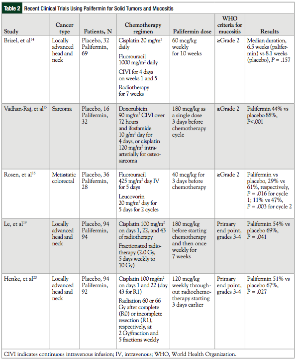 The use of palifermin in hematologic malignancies and stem-cell transplants has been established, but its efficacy in nonhematologic malignancies has yet to be conclusively determined.13 Several clinical trials have evaluated the use of palifermin in the prevention of mucositis in patients with solid tumors.14-19 A PubMed search for clinical trials that was limited to the past 15 years using the key words “palifermin,” “solid tumors,” and “mucositis” yielded several articles, as listed below and in Table 2.
