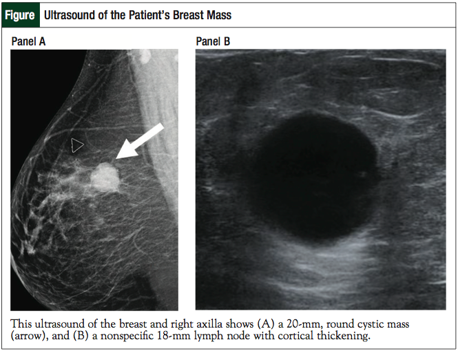 A 46-year-old white woman presented to our hospital with a palpable right breast mass. Her medical history included HIV, which was diagnosed in 1997. The patient presented with no pain or nipple discharge associated with the breast mass. Her physical examination was remarkable for a 1.8-cm × 1.7-cm mobile right breast mass, with no skin changes or palpable axillary lymphadenopathy. A diagnostic mammography demonstrated a medium- to high-density, 24-mm, round mass at the 12:00 to 1:00 position of the right breast. An ultrasound of the breast and right axilla showed a 20-mm, round cystic mass (Figure, Panel A) and a nonspecific 18-mm lymph node with cortical thickening (Figure, Panel B).