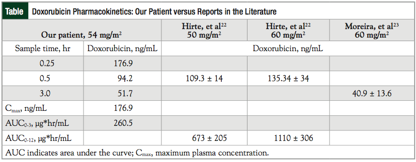 Because increased doxorubicin area under the curve (AUC) has been linked to toxicities, such as myelosuppression, we calculated the AUC for our patient using a linear trapezoidal algorithm with WinNonlin v5.2. Using the range of previously reported gamma half-lives of 13 to 50 hours, the AUC0-12 for our patient was predicted to be between 616 µg*hr/L and 691 µg*hr/L.20,21 The previously reported estimated doxorubicin AUC0-12 is 673 ± 205 µg*hr/L.13