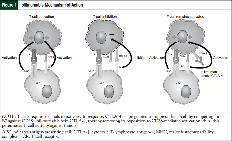 The recognition of CTLA-4’s critical role in immune downregulation led to drug development aimed at targeting this pathway.24 Two signals are required for the activation of a T-cell response. The first occurs when the T-cell binds the antigen presented by the antigen-presenting cell (APC) that is bound to the major histocompatibility complex. At the same time, CD28 interacts with the B7 molecule on the same APC, resulting in CTLA-4 upregulation. CTLA-4 competitively inhibits the binding of B7 to CD28 and therefore acts as a “brake” on the nascent immune response. The importance of this system is dramatically demonstrated in mice devoid of functional CTLA-4, who develop massive CD28-dependent expansion of autoreactive T-cells and die within 3 to 4 weeks as a result of rampant lymphoproliferation and lymphadenopathy. Ipilimumab blocks the CTLA-4 and, therefore, potentiates antitumor T-cell responses (Figure 1). Early studies in mice and primates, and later in humans, demonstrate that ipilimumab competitively binds to CTLA-4 more efficiently (an approximate 100-fold greater affinity) than native B7 while preserving CD28 signaling.25-30