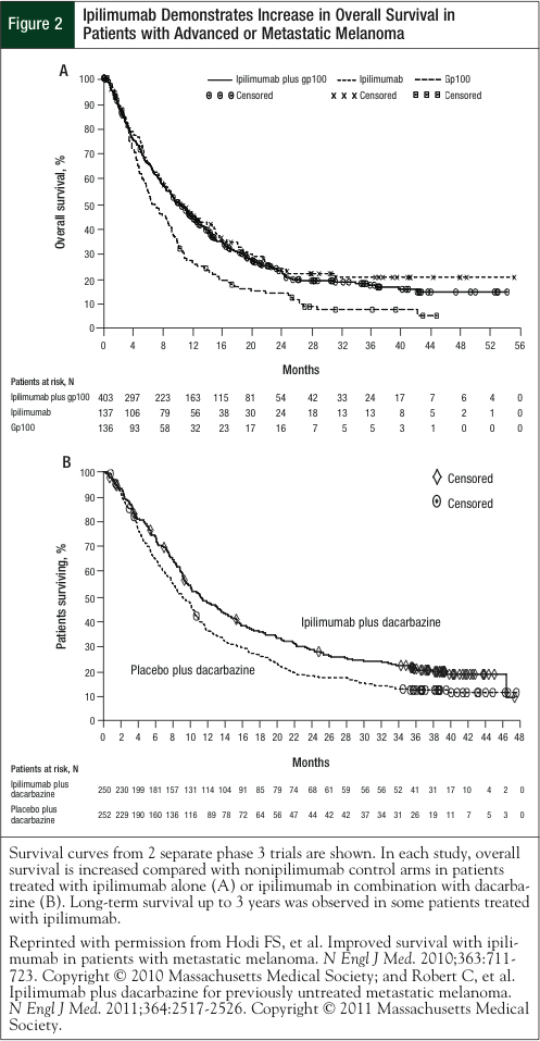 The second study—CA184-024—differed in ipilimumab dose, schedule, and subsequent toxicity profile.2 In this study, 502 treatment-naïve patients with unresectable stage III or stage IV melanoma received either ipilimumab in combination with dacarbazine (N = 250) or dacarbazine alone (N = 252). Ipilimumab was administered at a dose of 10 mg/kg on an induction of every 3 weeks for 4 cycles and included a maintenance phase. Patients with a response or stable disease to ipilimumab were randomized to ipilimumab or to placebo every 12 weeks as maintenance therapy.