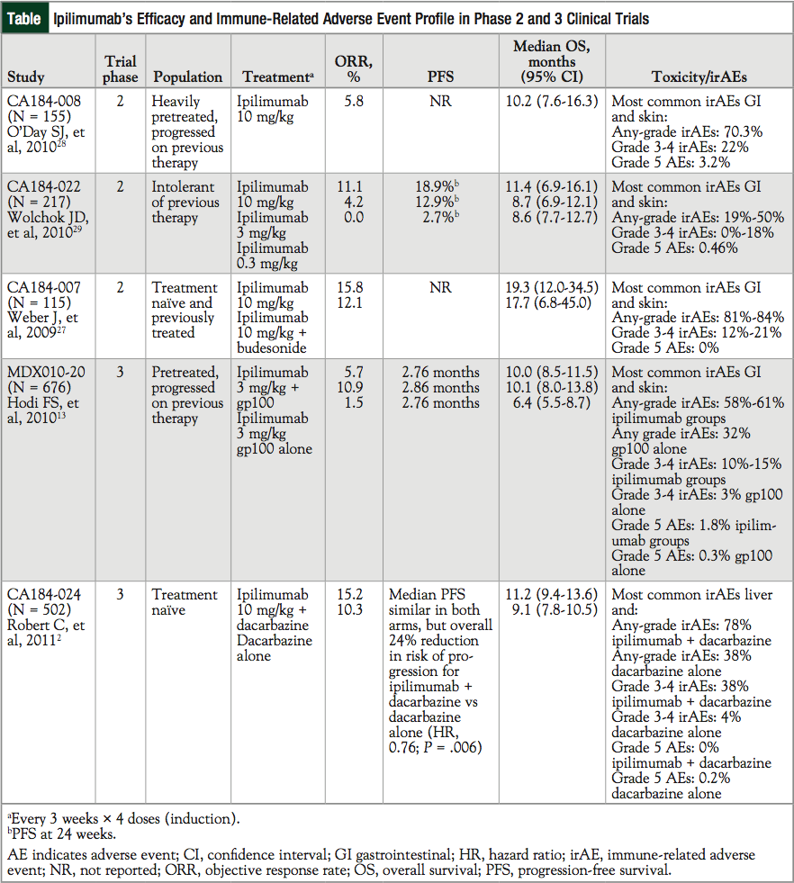 Discussion: Ipilimumab is unique in its response patterns, toxicities, and activity in subgroups of patients with melanoma. This drug produces responses that differ from the conventional responses that are observed with cytotoxic agents. Therefore, new immune-related response criteria have been proposed to prevent immature withdrawal of therapy with ipilimumab. Across ipilimumab studies, the most frequently affected organs were the gastrointestinal tract and skin; less frequently seen were hepatic, endocrine, and neurologic events. Ipilimumab’s immune related adverse events may be severe and long-lasting, but these are reversible with prompt recognition and early treatment.