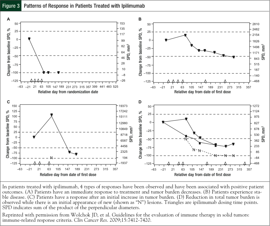 Two novel “mixed-response” patterns have been observed during the clinical development of ipilimumab.42 In one, response to ipilimumab therapy is seen after an initial increase in tumor burden. This flare-like type of response is thought to be associated with the inflammatory infiltration of T-cells into the tumor, thereby expanding its size and mimicking progressive disease. In another pattern, the reduction in total tumor burden occurs during or after the appearance of new lesions. This could be because after ipilimumab-mediated activation of the immune system, an effective antitumor immune response takes time to develop, whereas tumor growth proceeds unabated. Both the traditional and the new response patterns are associated with favorable survival.42