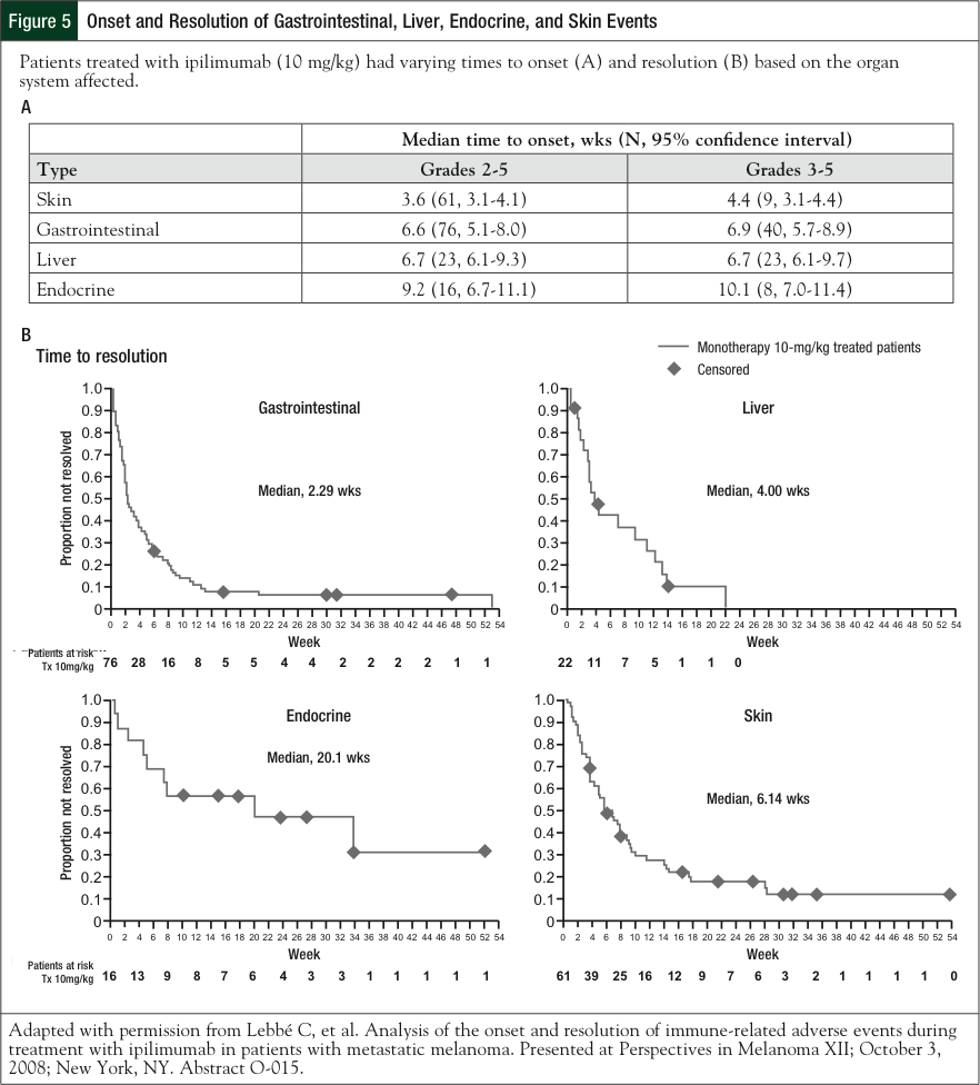 However, depending on the organ system affected, these rates can vary (based on the 10-mg/kg dose; Figure 5).48 Dermatologic irAEs are typically the earliest to occur, sometimes after only 1 or 2 doses of ipilimumab, whereas endocrine events appear within a median of 11 to 19 weeks after initiation of ipilimumab. The time to resolution also varies by organ system: skin, GI, and liver events resolve within a few weeks, whereas endocrine events take approximately 20 weeks to resolve and, in some cases, are irreversible (Figure 5).48 During the course of the clinical development of ipilimumab, a standard set of guidelines was developed to provide advice on the management of irAEs.