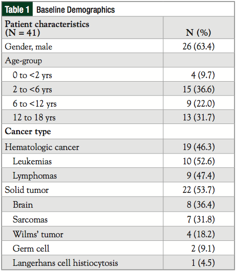 Baseline demographics are represented in Table 1. The most common age-groups at diagnosis were 2 to <6 years and 12 to 18 years. Overall, the mean age at diagnosis was 8.4 (± 0.9) years. Diagnosis with solid tumor was more common than hematologic cancer, occurring in 53.7% of patients. Within this group, brain tumors and sarcomas exceeded other forms of solid tumors while leukemias and lymphomas were nearly evenly split among the hematologic malignancies. Of note, acute lymphoblastic leukemia (ALL) was the most common form of leukemia, occurring in 8 of 10 cases (50% in females). Mean weight percentile at baseline for all ages was 60.6 (± 4.9); BMI percentile was similar at 60.8 (± 5.3).
