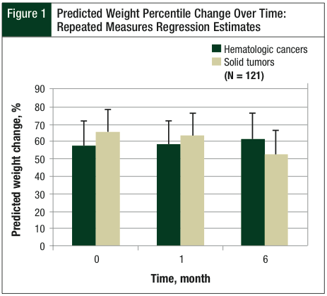 Results: A total of 42 children were diagnosed with cancer during the study between January 1, 2010, and June 30, 2010, resulting in 121 weight measurements. Patients diagnosed with solid tumors lost 13.2 weight percentiles over the study period whereas those with hematologic malignancies had an increase of 3.0 weight percentiles (P = .013). A significant (P = .041) gender difference was found, with female patients exhibiting a greater drop in weight percentiles (20.3) compared with males (0.51), and no other differences were observed.