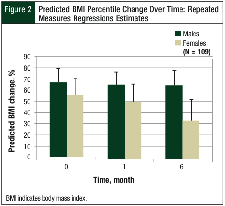 Change in BMI percentile over 6 months was compared among genders (Figure 2), also with significant results. Male patients demonstrated a decrease in BMI percentile of 0.51 and female patients had a loss of 20.3 in BMI percentile (P = .041). Because BMI is not a viable measurement until children reach age 2 years or older, 4 patients were excluded from this analysis, leaving 109 measurements. Differences in height and height percentile were not statistically significant among the genders or the type of cancer diagnosis.