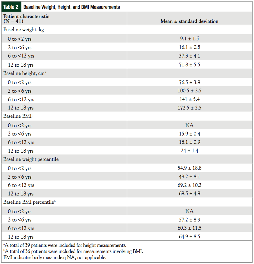 To assess the possibility of confounding measures, information on the patient’s nutritional status and interventions was also collected. The interventions reviewed included use of total parenteral nutrition (TPN), enteral tube feedings, and appetite stimulants. When available, albumin and prealbumin levels were also documented as markers of nutritional status. Cancer types were stratified into hematologic malignancies and solid tumors. Patients were also sorted into 4 groups based on their age, including 0 to <2 years, 2 to <6, 6 to <12, and 12 to 18. Groupings were based on similar predicted growth velocities.