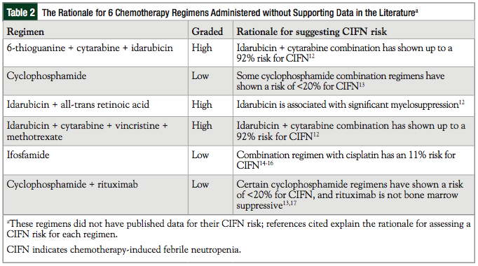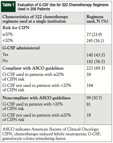 In 2012, the American Society of Clinical Oncology (ASCO) identified the appropriate use of G-CSFs as 1 of the top 5 recommendations to reduce expenditures for patients with cancer.1 In addition to a potential financial detriment, inappropriate prescribing of these medications may also lead to unnecessary adverse reactions, most often injection-site reactions, flu-like symptoms, and bone pain.2 The ASCO guidelines define inappropriate use as administering these medications to patients with a low, <20% risk for developing CIFN.1,6
