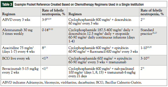 The completed reference guide based on our review of the literature contained CIFN rates for 100 different chemotherapy regimens. Only 24 regimens showed a risk of >20% for developing this complication.