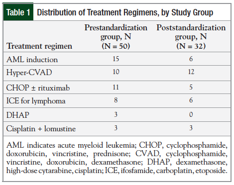 The most frequently administered regimen in the prestandardization group was the AML induction regimen (categorized as moderately emetogenic, days 1-3), with 15 of the 50 patients receiving this therapy. The most frequently administered regimen in the poststandardization group was hyper-CVAD, course A and B (categorized as moderately emetogenic), with 12 of the 32 patients receiving this regimen.