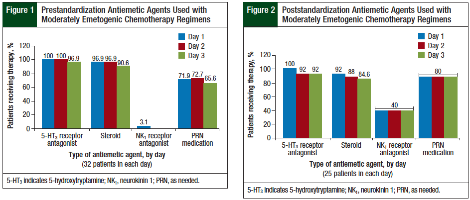 The prescribing of NK1 receptor antagonists increased from 3% in the prestandardization group to 40% in the poststandardization group. The use of NK1 receptor antagonists is optional for moderately emetogenic chemotherapy, according to the NCCN guidelines.3 In addition, the prescribing of PRN medications with different mechanisms of action increased from 69% (range, 65.6%-72.7%) in the prestandardization group to 88% in the poststandardization group.