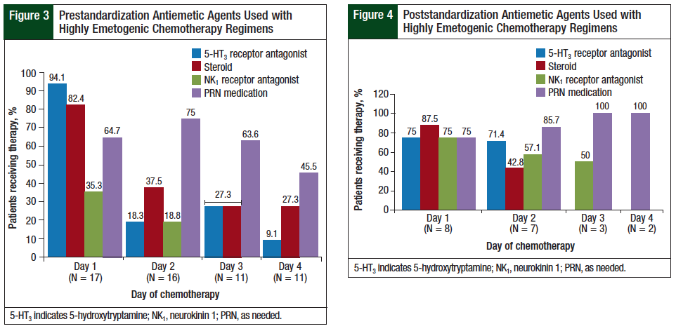 The use of scheduled 5-HT3 receptor antagonists on day 1 decreased from 94% in the prestandardization group to 75% in the poststandardization group. In this study, steroid prescribing for highly emetogenic regimens on day 1 and day 2 was similar between the prestandardization and the poststandardization groups. The use of NK1 receptor antagonists on day 1 of highly emetogenic regimens increased from 35% in the prestandardization group to 75% in the poststandardization group. The prescribing of PRN medications with different mechanisms of action increased from 60% (range, 45.5%-75%) in the prestandardization group to 87% (range, 75%-100%) in the poststandardization group.