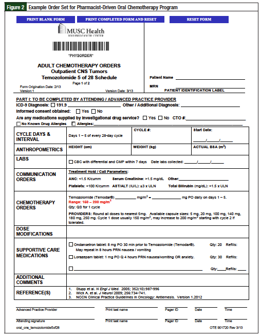 As part of an NCI-designated cancer center affiliated with an academic medical center, we developed a PDOC to increase patient safety. The clinical pharmacists embedded within the outpatient neuro-oncology and gastrointestinal (GI) oncology clinics verified order accuracy, medication procurement, and patient education associated with oral chemotherapy. The decision to initiate the program within these clinics was made because capecitabine and temozolomide require a dose calculation for prescribing that increases the likelihood for medication errors.9