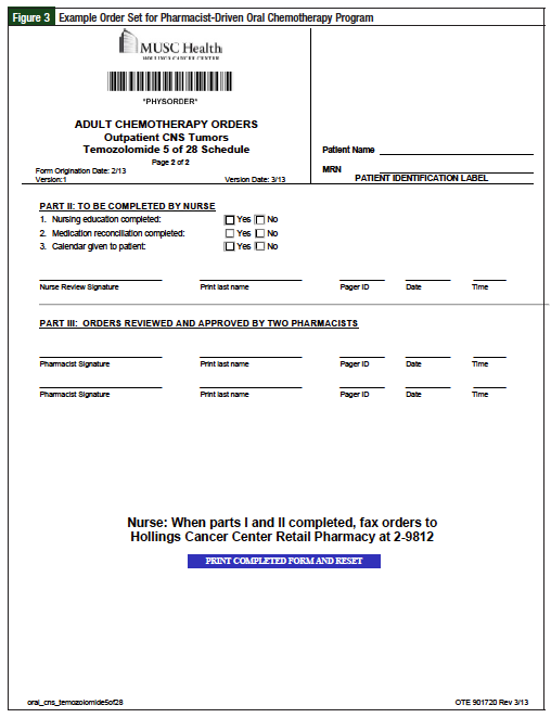 The workflow for the PDOC is described in Figure 1. Although electronic prescribing was available, we first developed preprinted order sets for oral chemotherapy prescriptions, including agents such as tyrosine kinase inhibitors (Figures 2 and 3; Supplemental Figure online). The preprinted order sets contained references to the specific chemotherapy regimen, and fields for laboratory and monitoring parameters. They were implemented because the EMR at the time of the study was not robust enough to transmit all of the data needed for safe and accurate prescribing of oral chemotherapy. Prescribers used the order forms to write oral chemotherapy prescriptions, then an in-clinic pharmacist reviewed each prescription.
