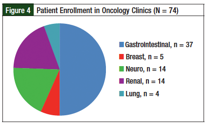Seventy-four patients and 75 new-start prescriptions were included in the study; 1 patient had 2 prescriptions for oral chemotherapy during the evaluation period. Of these prescriptions, 68% (n = 51/75) were from clinics with the PDOC (neuro-oncology and GI oncology), and 32% (n = 24/75) were from the non-PDOC clinics (breast, renal, and lung). Figures 4 and 5 describe patient enrollment in specific clinics and medications prescribed, respectively.