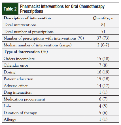 Previous research has shown that pharmacists can increase the accuracy of prescribing oral chemotherapy.9,11 An earlier study reviewing capecitabine and temozolomide prescriptions found that pharmacists can make clinically significant interventions by performing double-checks on computerized orders.9 Pharmacists in this setting would receive a daily report of all capecitabine and temozolomide prescriptions ordered within the past 24 hours. They would then review the orders to ensure accurate dosing and compliance with previously studied regimens. If pharmacists found a discrepancy >10%, they notified physicians to correct the orders. Through this review process, pharmacists corrected errors on up to 4% of oral chemotherapy prescriptions. This study provided preliminary evidence to suggest that pharmacists can increase the accuracy of oral chemotherapy orders. However, other reviews along with our study demonstrate that pharmacists can further impact patient care through oral chemotherapy programs. The design of these programs, however, can differ according to institutional practice models.