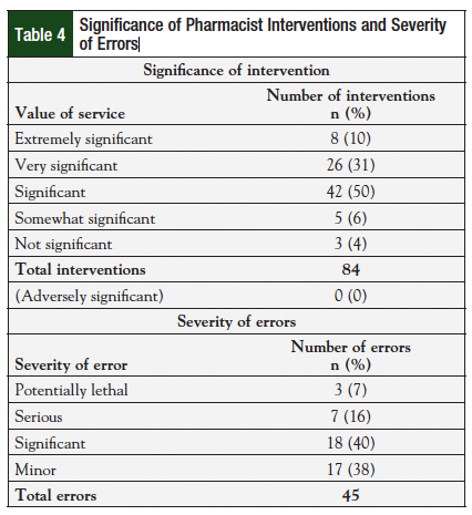 A pharmacist not involved in the PDOC or data collection reviewed the interventions and rated their significance based on a previously tested scale,10 which rates the potential severity of the error prevented, and the clinical value of service. This scale has been tested by pharmacists and physicians as a reliable way to classify pharmacist interventions.10 In this study, pharmacist interventions from the PDOC were ranked based on their clinical significance. If the intervention involved correcting an error, it was further classified by the severity of the error.