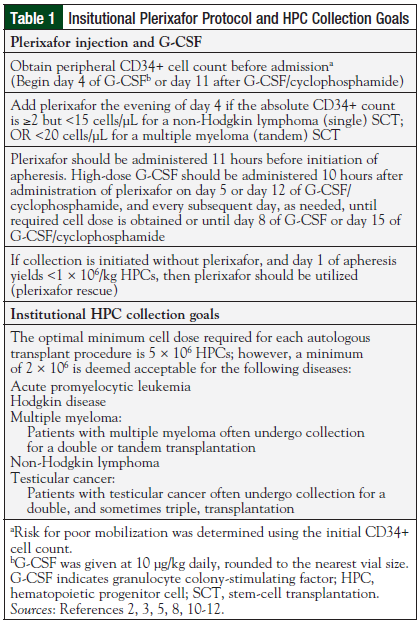 Prior to protocol implementation, all eligible patients received plerixafor as part of their stem-cell mobilization regimen. Although many institutions have developed algorithms and protocols to improve stem-cell mobilization efficacy and cost-effectiveness,9,11,13 to our knowledge, there are no known comparison studies of mobilization costs before and after implementation of the protocol.