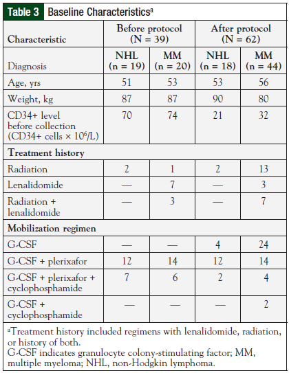 The number of patients who underwent chemomobilization with cyclophosphamide, G-CSF, and plerixafor was higher in both subgroups (NHL and multiple myeloma) of preprotocol patients than among postprotocol patients. These differences in baseline characteristics, coupled with the patient-specific nature of stem-cell mobilization—including greater difficulty of mobilization with NHL—may have affected mobilization response.