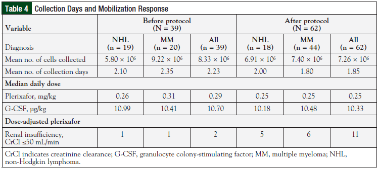 Mobilization responses were evaluated for the pre- and postprotocol groups, and for the subsets of patients with multiple myeloma or NHL in each group (Table 4). Before protocol implementation, the mean number of cells collected was 8.33 × 106; the average was 5.80 × 106 cells among patients with NHL, and 9.22 × 106 cells among those with multiple myeloma. After protocol implementation, the mean number of cells collected was 7.26 × 106, with an average of 6.91 × 106 cells for patients with NHL, and 7.40 × 106 cells for patients with multiple myeloma.