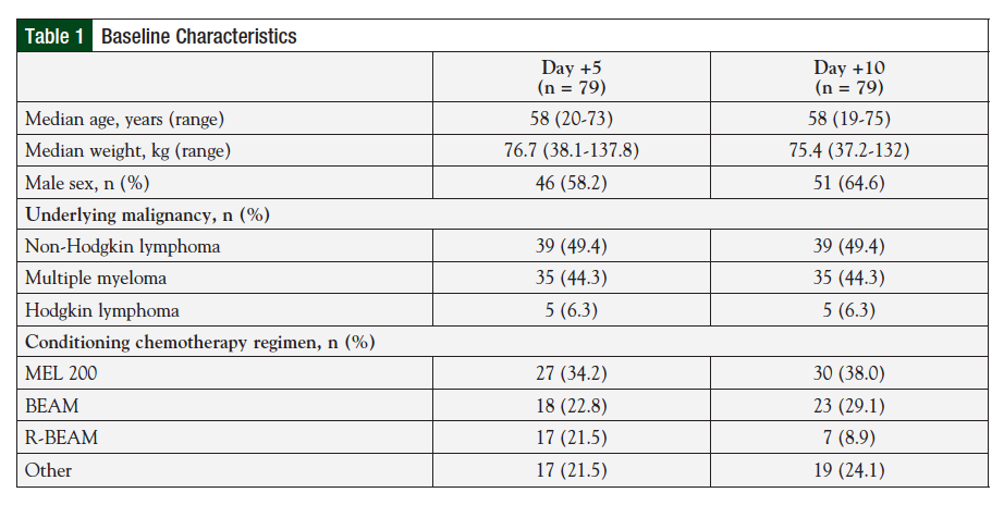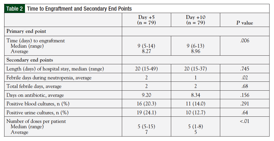 The primary end point was time to engraftment, which was defined as absolute neutrophil count (ANC) recovery to ≥500 cells/mm3 sustained for 48 hours, or ANC ≥1000 cells/mm3 sustained for 24 hours. Secondary end points included length of hospitalization, total febrile days during neutropenia and hospitalization, number of days on antibiotic(s), and rates of infection (assessed by results of urine and/or blood cultures). Length of hospital stay was defined as the number of days from admission until discharge. Fever was defined as a single temperature of ≥101.0°F (≥38.3°C), or a temperature of ≥100.4°F (≥38.0°C) sustained for 1 hour. The number of filgrastim doses administered was compared in the 2 groups for cost-analysis purposes. Per our institutional policy, patients who weighed ≤70kg received 300µg/d until engraftment, and those who weighed >70kg received 480µg/d until engraftment.