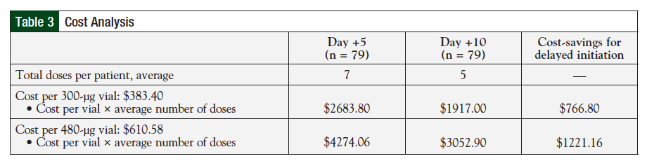 A cost analysis was performed using the average wholesale price per vial for filgrastim: $383.40 for a 300-µg vial, and $610.58 for a 480-µg vial. In the day +5 group, 27 patients required the 300-µg dose, and 52 required the 480-µg dose. Similarly, in the day +10 group, 25 patients received a dose of 300 µg, and 54 received a dose of 480 µg. The average number of doses was 7 in the day +5 group, and only 5 in the day +10 group. The average cost-savings per patient for delaying initiation of filgrastim to day +10 (+1) was $766.80 for the 300-µg dose, and $1221.16 for the 480-µg dose. Results of the cost analysis are summarized in Table 3.