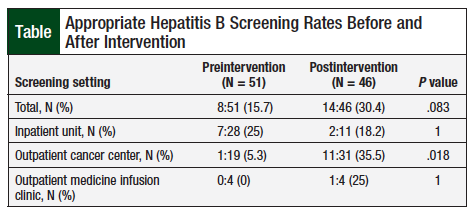 The overall correct HBV screening rate increased as a result of large improvements in the outpatient setting. Screening rates increased by approximately 30% in the outpatient cancer center and by 25% in the outpatient medicine infusion center. Although screening improved in both outpatient clinics, the difference in overall screening was not statistically significant between the preintervention and postintervention groups. The 25% increase in appropriate screening rates within the outpatient cancer center was found to be statistically significant (0% vs 25%, respectively; P = .0184). However, there were only 4 patients in each group.