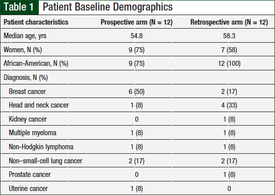 Of the total patient population (N = 24), the majority were women (67%) and African-American (88%). As shown in Table 1, patients with any cancer diagnosis were included, but the most common cancer types included breast cancer (33%), non–small-cell lung cancer (17%), and head and neck cancer (21%).